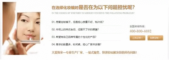 從(cóng)其網站(zhàn)上,我們可(kě)以看(kàn)到的網頁的第三欄内容是一個“在選着化妝鏡時是否在爲以下問(wèn)題擔憂呢(ne)?”,這樣一個一級标題。
